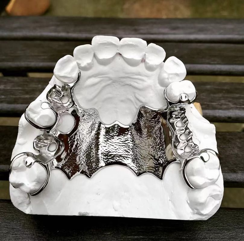 Metallrahmenpartien basieren auf einem präzisen Guss, einem Metallrahmen.Das am häufigsten verwendete Metall ist eine sehr harte Chrom-/Kobaltlegierung, die es dem Rahmen ermöglicht, sehr dünn zu sein, was zu Komfort ohne die Sorge um Bruch führt.